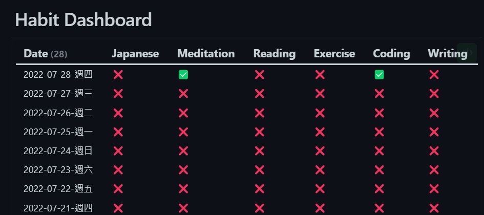 我的發想是,Dataview可以檢視並顯示不同頁面的Metadata,那如果我把習慣完成的狀況儲存成Daily Note的Metadata,是否就能利用Dataview將其以表格的形式顯示出來呢?接著我用關鍵字上網搜尋,竟然發現有人跟我的想法一樣,而且已經在Obsidian中實現了,我對自己的遲鈍感到一點羞愧。